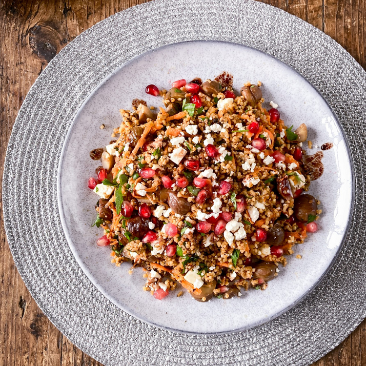 - Σε ένα μπολ, ανακατέψτε τη σαλάτα ιταλική με τα ψιλοκομμένα κάστανα, τις σταφίδες και τους σπόρους ροδιού.