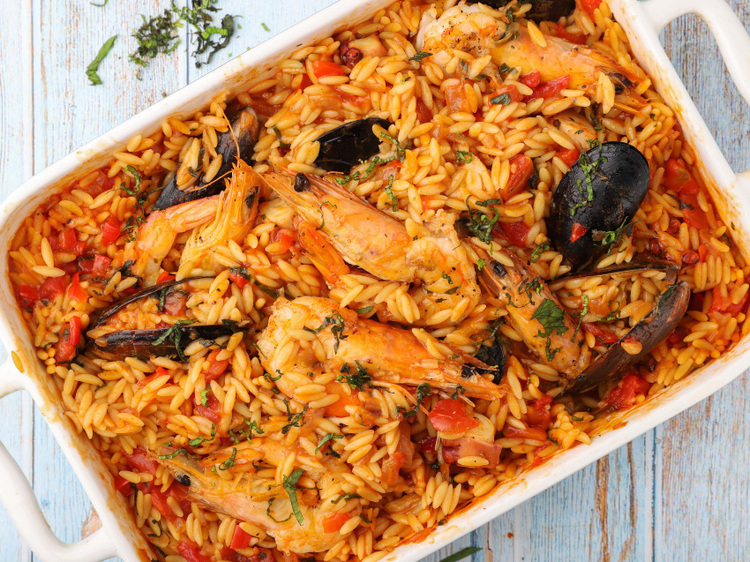 Ανακατεύετε πολύ καλά, αδειάζετε όλο το περιεχόμενο της κατσαρόλας σε ένα πυρίμαχο σκεύος και ψήνετε στο φούρνο για άλλα 10-15 λεπτά μέχρι να ψηθούν τα θαλασσινά και να μαλακώσει το κριθαράκι. Σε περίπτωση που έχει εξατμιστεί όλο το νερό, προσθέτετε ακόμη λίγο.