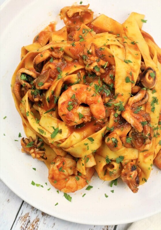 - Συνδυασμός με τα μακαρόνια: Προσθέτετε τα βρασμένα μακαρόνια στο τηγάνι με τα θαλασσινά και ανακατεύετε καλά για να ενσωματωθούν οι γεύσεις. Αν χρειάζεται, προσθέτετε λίγο από το νερό του βρασμού των μακαρονιών για να δημιουργήσετε μια πιο βελούδινη σάλτσα.