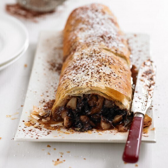 Κόβετε το στρούντελ σε χοντρές φέτες και το αχνίζετε με άχνη και κακάο.