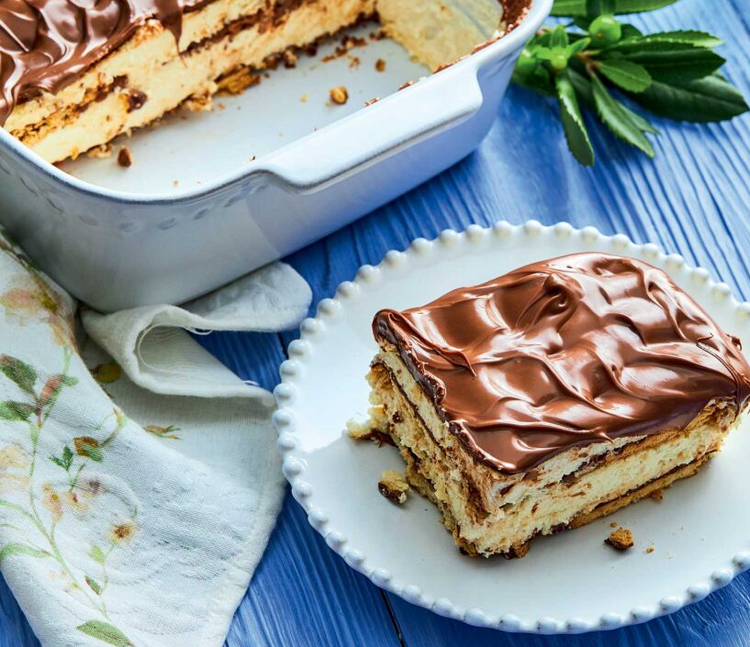 Τοποθετείτε το ταψί στο ψυγείο για 4 ώρες. Κόβετε σε μεσαίου μεγέθους τετράγωνα κομμάτια και σερβίρετε!